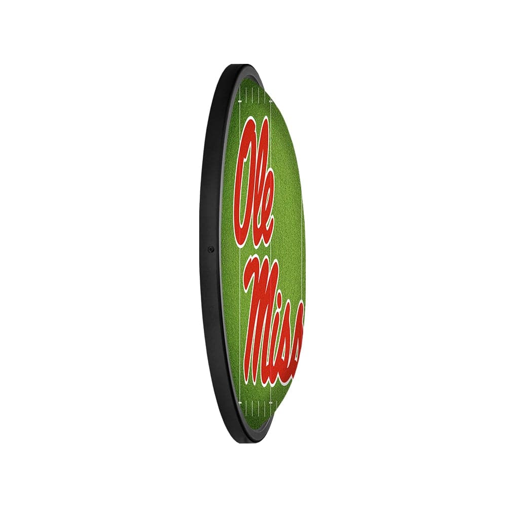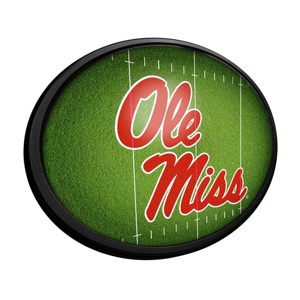 Make it game day EVERYDAY with our Ole Miss Rebels "On the 50" Oval Slimline Lighted Wall Sign. It's the perfect modern styled sign for any wall. Whether it's your fan cave, office, game room, garage, or dorm, this decorative light with it's football field design is the perfect way to show your love for Ole Miss Football. Its high resolution digitally printed face provides a photographic quality image with a high gloss finish. It is illuminated with the latest in LED technology and only uses 12 volts, making it perfect to bring with you to tailgate or in your homegating headquarters. It comes with a 6 foot power cord and an in-line switch. Mounting hardware included. This is an officially licensed product of the University of Mississippi and is made in the USA.