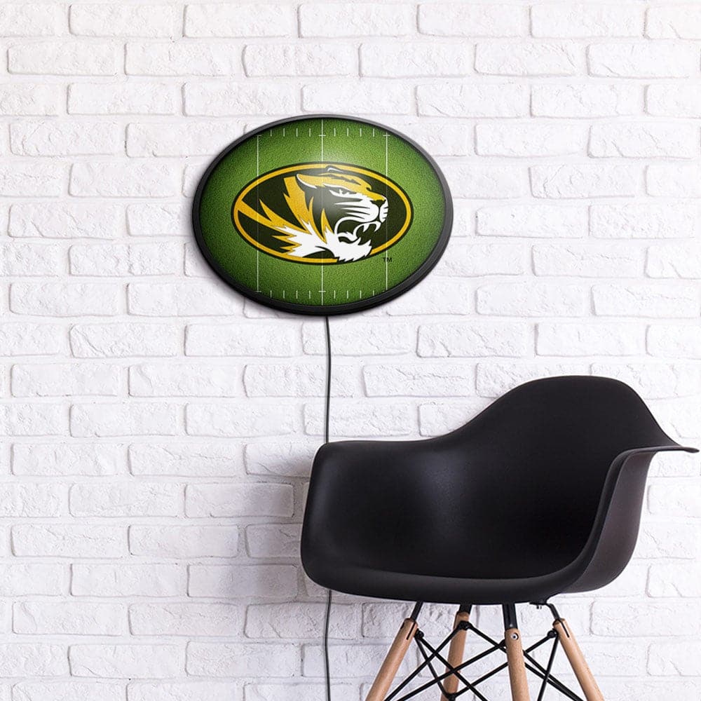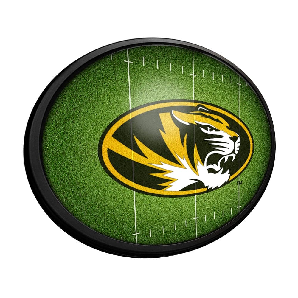Make it game day EVERYDAY with our Missouri Tigers "On the 50" Oval Slimline Lighted Wall Sign. It's the perfect modern styled sign for any wall. Whether it's your fan cave, office, game room, garage, or dorm, this decorative light with it's football field design is the perfect way to show your love for Missouri Football. Its high resolution digitally printed face provides a photographic quality image with a high gloss finish. It is illuminated with the latest in LED technology and only uses 12 volts, making it perfect to bring with you to tailgate or in your homegating headquarters. It comes with a 6 foot power cord and an in-line switch. Mounting hardware included. This is an officially licensed product of the University of Missouri and is made in the USA.
