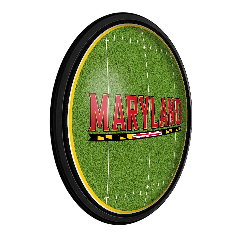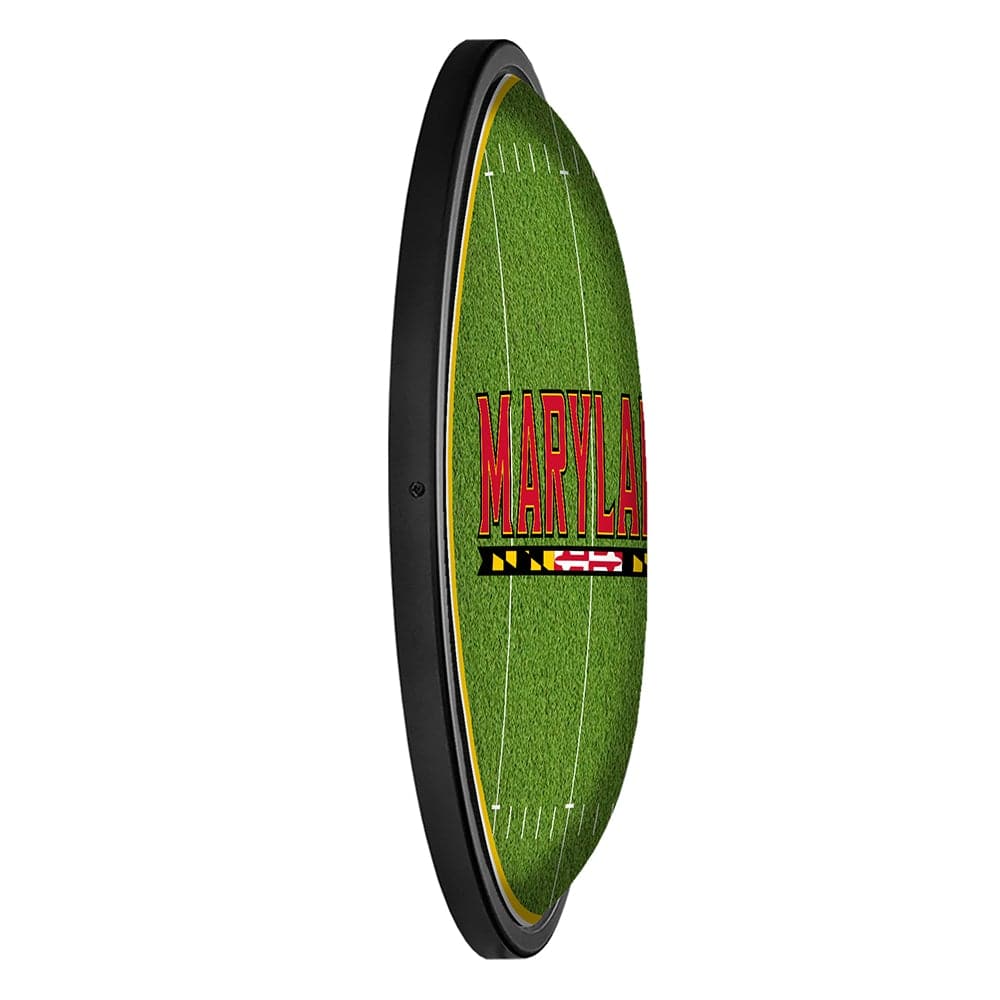 Our Maryland Terrapins "On the 50" Slimline Lighted Wall Sign is the perfect modern styled sign for any wall. Whether it's your fan cave, office, game room, garage, or dorm, this decorative light with it's football field design is the perfect way to show your love for the Terrapins. Its high resolution digitally printed face provides a photographic quality image with a high gloss finish. It is illuminated with the latest in LED technology and only uses 12 volts, making it perfect to bring with you to tailgate or in your homegating headquarters. It comes with a 6 foot power cord and an in-line switch. Mounting hardware included. This is an officially licensed product of the University of Maryland and is made in the USA.