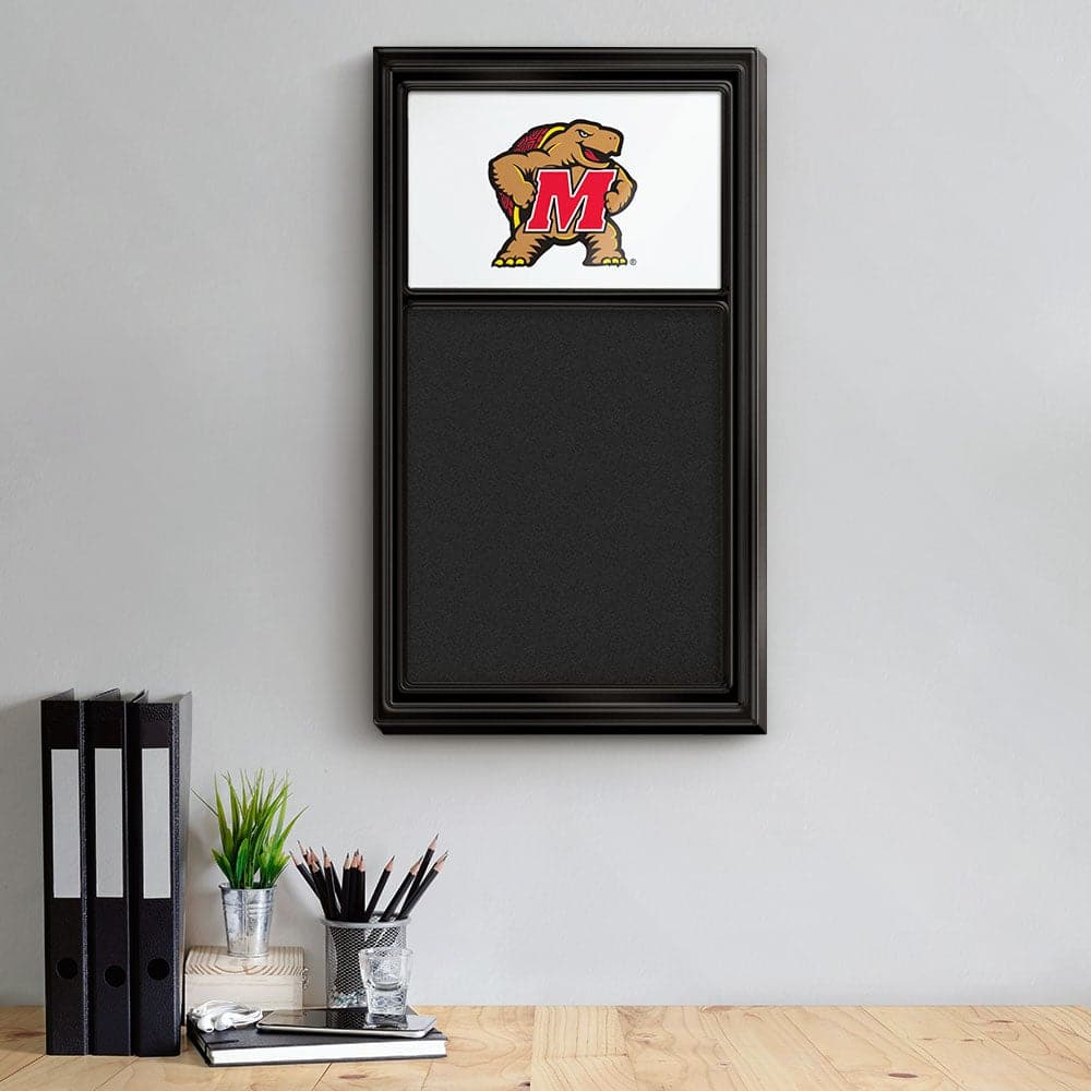The University of Maryland Chalk Note Board is perfect for keeping score or writing messages in any fan cave, game room, office or dorm. Our team chalkboard sign is injection molded with it's high-resolution digitally printed face, high gloss finish, and silk-screened dry erase surface and will provide hours of use while adding a finishing touch to any wall in the house. Mounting hardware and chalk included. This is an officially licensed product of the Terrapins and made in the USA.