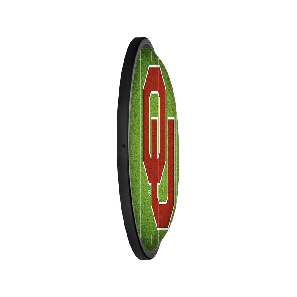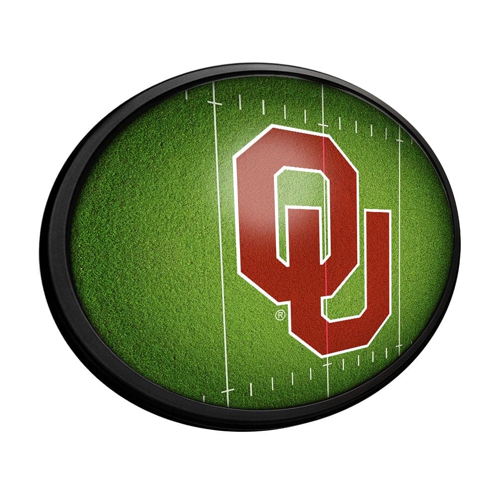 Make it game day EVERYDAY with our Oklahoma Sooners "On the 50" Oval Slimline Lighted Wall Sign. It's the perfect modern styled sign for any wall. Whether it's your fan cave, office, game room, garage, or dorm, this decorative light with it's football field design is the perfect way to show your love for Oklahoma Football. Its high resolution digitally printed face provides a photographic quality image with a high gloss finish. It is illuminated with the latest in LED technology and only uses 12 volts, making it perfect to bring with you to tailgate or in your homegating headquarters. It comes with a 6 foot power cord and an in-line switch. Mounting hardware included. This is an officially licensed product of the University of Oklahoma and is made in the USA.