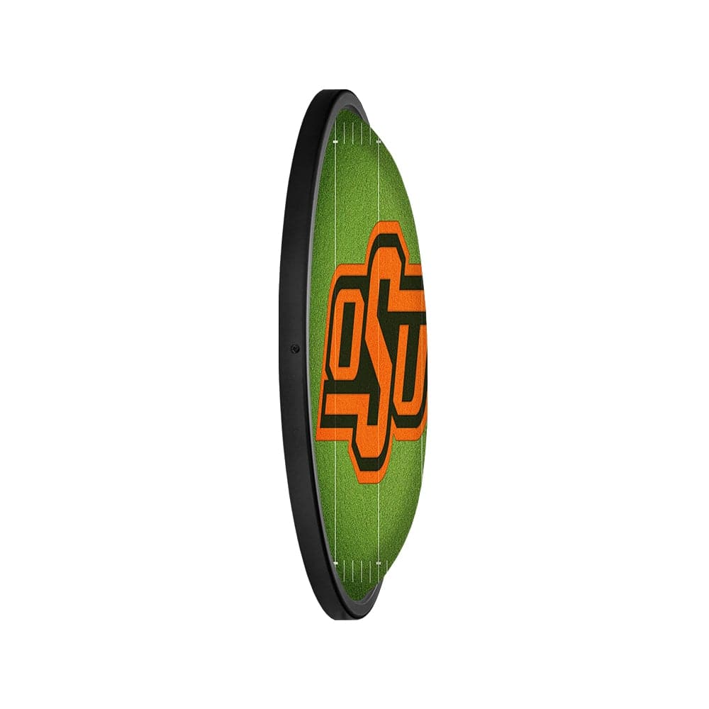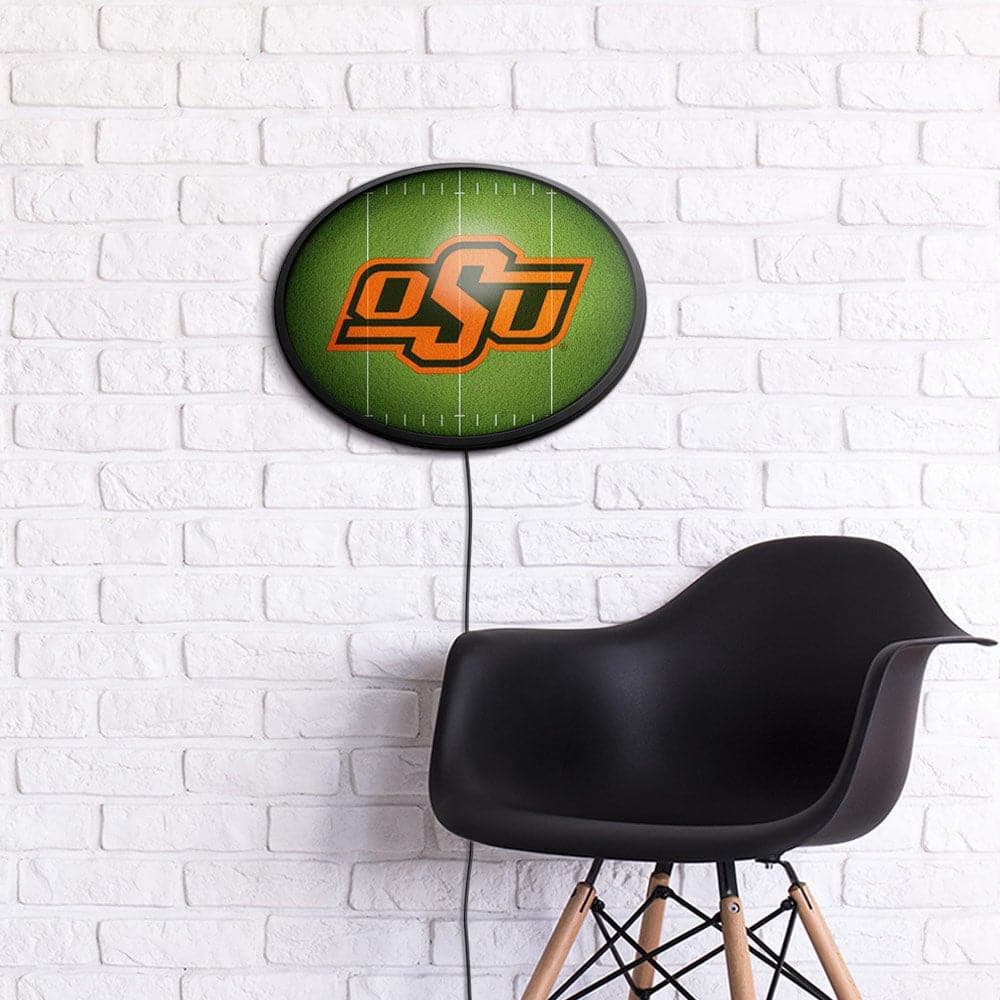 Make it game day EVERYDAY with our Oklahoma State Cowboys "On the 50" Oval Slimline Lighted Wall Sign. It's the perfect modern styled sign for any wall. Whether it's your fan cave, office, game room, garage, or dorm, this decorative light with it's football field design is the perfect way to show your love for Oklahoma State Football. Its high resolution digitally printed face provides a photographic quality image with a high gloss finish. It is illuminated with the latest in LED technology and only uses 12 volts, making it perfect to bring with you to tailgate or in your homegating headquarters. It comes with a 6 foot power cord and an in-line switch. Mounting hardware included. This is an officially licensed product of Oklahoma State University and is made in the USA.