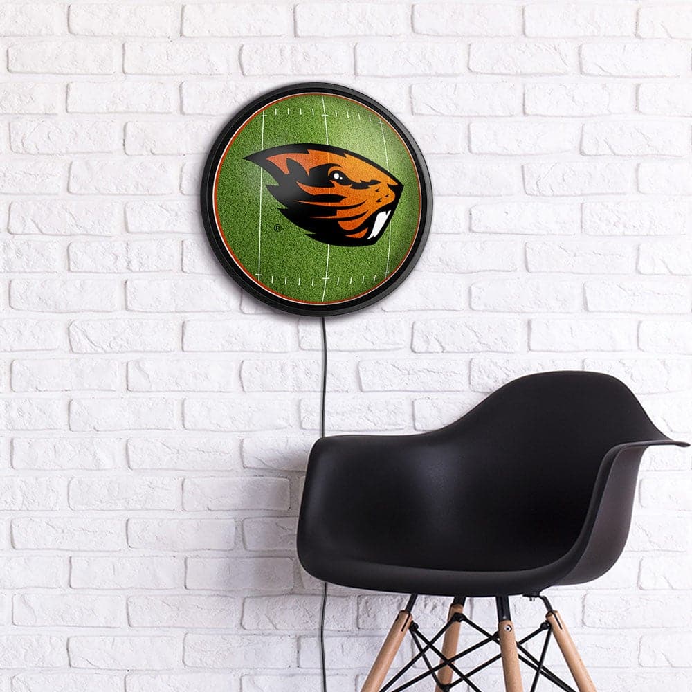 Our Oregon State Beavers "On the 50" Slimline Lighted Wall Sign is the perfect modern styled sign for any wall. Whether it's your fan cave, office, game room, garage, or dorm, this decorative light with it's football field design is the perfect way to show your love for the Beavers. Its high resolution digitally printed face provides a photographic quality image with a high gloss finish. It is illuminated with the latest in LED technology and only uses 12 volts, making it perfect to bring with you to tailgate or in your homegating headquarters. It comes with a 6 foot power cord and an in-line switch. Mounting hardware included. This is an officially licensed product of Oregon State University and is made in the USA.