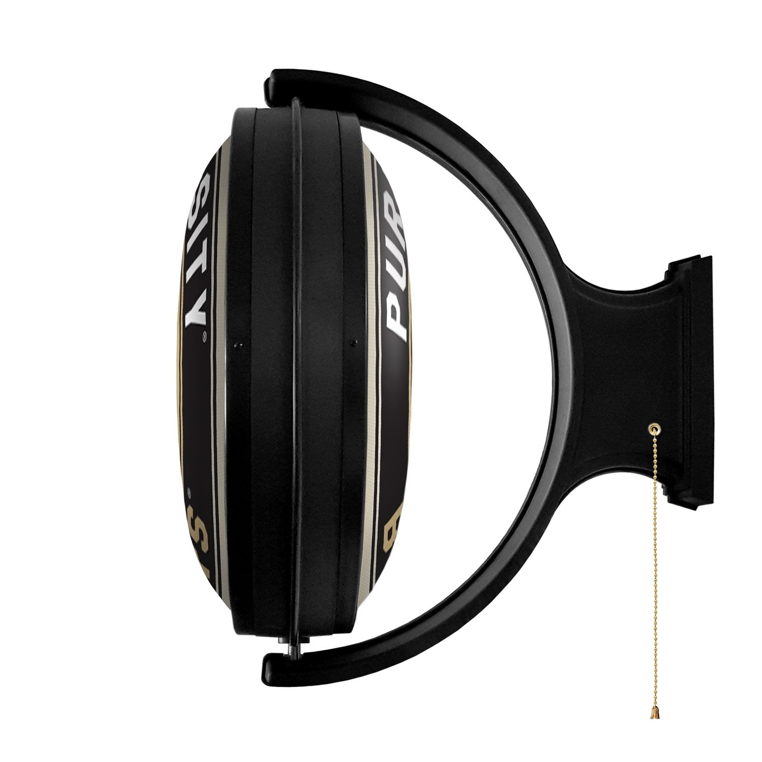 The Original Purdue University Rotating Lighted Wall Sign, both lights up and spins while displaying your team pride for the Boilermakers. Whether it's your fan cave, office, game room, garage, or dorm, this decorative sign is the perfect addition to any wall. It showcases the latest in LED technology and only uses 12 watts of power. Injection molded, it comes with an 8’ power cord and a metal pull chain. Mounting hardware included and installation takes no more than 10 minutes. This is an officially licensed product of Purdue and made in the USA.