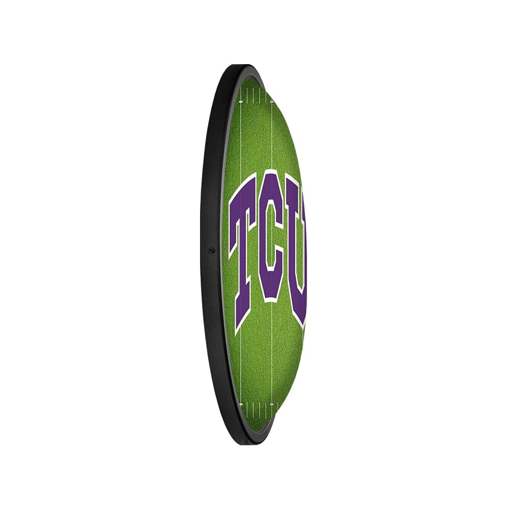 Make it game day EVERYDAY with our TCU Horned Frogs "On the 50" Oval Slimline Lighted Wall Sign. It's the perfect modern styled sign for any wall. Whether it's your fan cave, office, game room, garage, or dorm, this decorative light with it's football field design is the perfect way to show your love for TCU Football. Its high resolution digitally printed face provides a photographic quality image with a high gloss finish. It is illuminated with the latest in LED technology and only uses 12 volts, making it perfect to bring with you to tailgate or in your homegating headquarters. It comes with a 6 foot power cord and an in-line switch. Mounting hardware included. This is an officially licensed product of Texas Christian University and is made in the USA.
